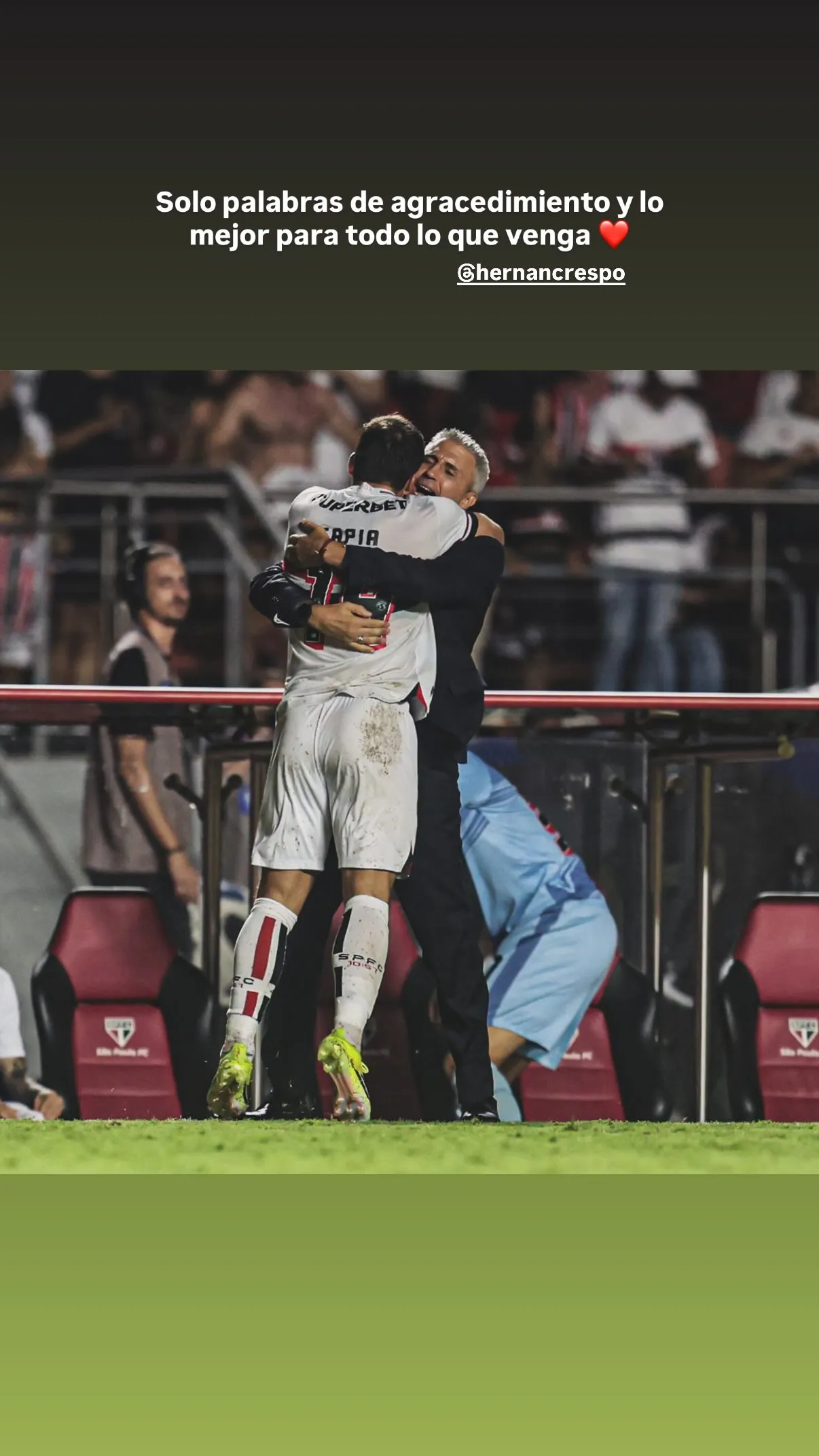 “Solo palabras de agradecimiento y lo mejor para todo lo que venga“, fue el mensaje que Gonzalo Tapia dedicó a Hernán Crespo por la confianza que le brindó desde que en julio del 2025 llegó a São Paulo, proveniente de River Plate.