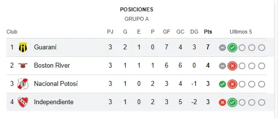 Con este resultado, Independiente quedó último por diferencia de goles en su grupo por la Copa Sudamericana con tres puntos. Comparte sitial con Nacional Potosí, mientras que Boston River está en la segunda posición con cuatro unidades. Guaraní es puntero con 7 puntos.