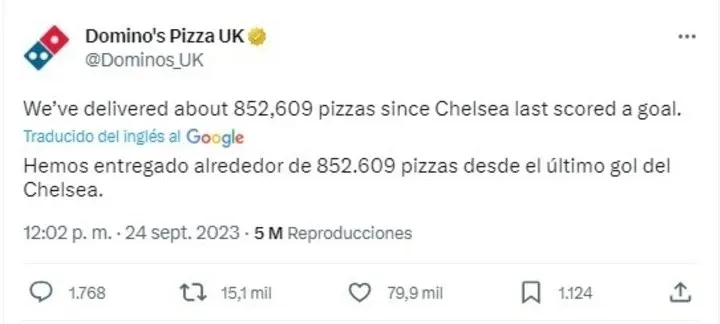 “Hemos entregado alrededor de 852.609 pizzas desde el último gol del Chelsea”, señalaron en su cuenta, desatando las risas de la gran mayoría, aunque también críticas de algunos seguidores del Chelsea que ya no pueden más con la anemia de gol de su equipo.