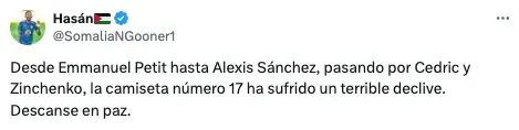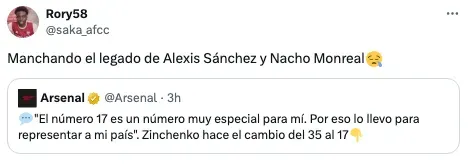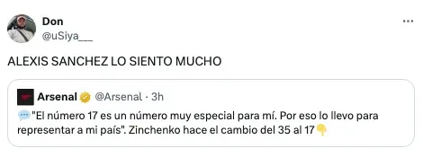 Por lo mismo los fanáticos del Arsenal desataron su molestia al ver como nuevamente “cualquier” jugador ocupa el dorsal que destacó a Sánchez. “Manchan el legado de Alexis”, y “La camiseta número 17 ha sufrido n terrible declive”, fueron parte de los mensajes desplegados en redes sociales contra el ex Manchester City.