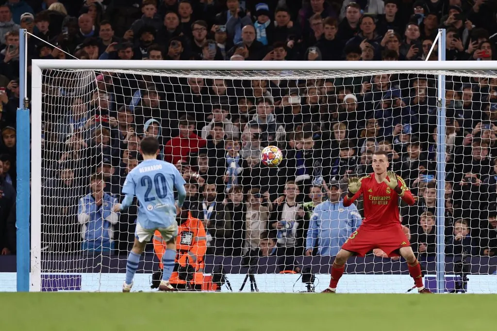 El portugués decidió pegarle al centro del arco y el portero ucraniano del Real Madrid, Andriy Lunin, ni siquiera se movió para detenerlo. Para más remate, el Manchester City terminó eliminado tras el gol definitivo de Antonio Rüdiger.