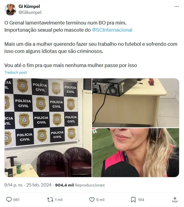 Pero no quedó allí, pues Kümpel afirmó en su cuenta de X que puso la denuncia por acoso en la Policía Civil de Porto Alegre, pues advierte que el suyo es un caso más contra las mujeres periodistas “que intentan hacer su trabajo en el fútbol y sufren a unos idiotas que son unos delincuentes“.