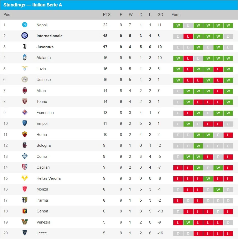 Gracias a esta igualdad, los lombardos se quedan en la segunda posición de la Tabla con 18 puntos, un punto más que la Vecchia Signora, quien se mantiene en en el tercer lugar con 17. Cabe señalar que el líder del torneo es Nápoli con 22 unidades.