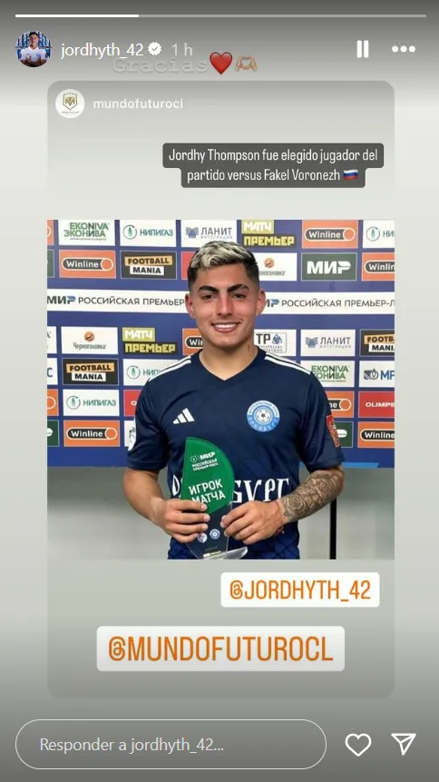 Así lo difundió la cuenta de Instagram de Mundo Futuro, agencia de representación que asesora la carrera de Jordhy Thompson. “Fue elegido el jugador del partido”, rezaba el mensaje de la empresa, que fue respondido con afecto por el jugador de 19 años.