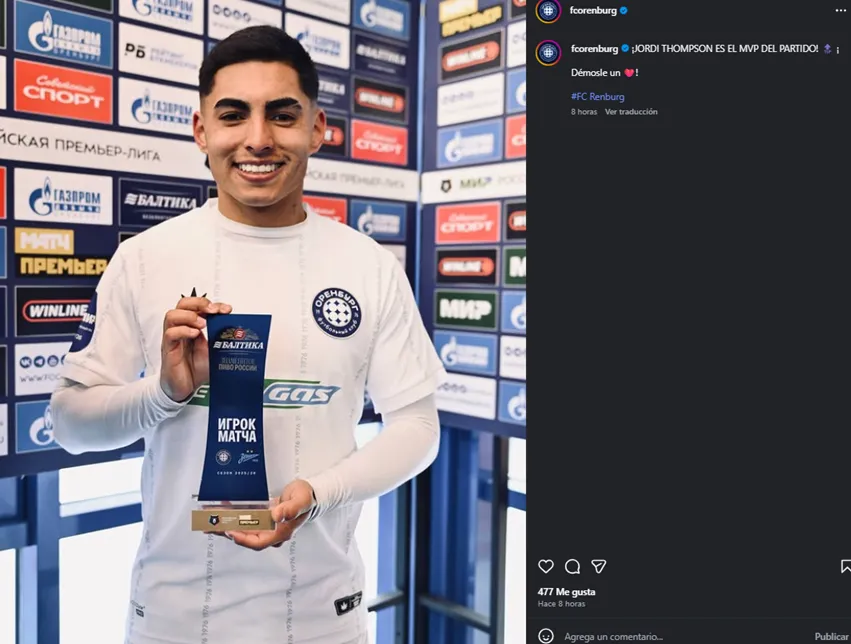 Orenburg celebró la actuación del chileno y a través de redes sociales subieron la imagen del ex jugador albo, acompañado del siguiente mensaje: “JORDY THOMPSON ES EL MVP DEL PARTIDO! 🔝 ¡Démosle un ❤️! #FC Orenburg”.