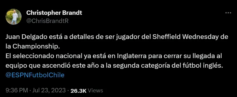 Así al menos lo informó el periodista de ESPN Christopher Brandt, quien dio a conocer la información del futbolista surgido en las divisiones inferiores de Colo Colo. “El seleccionado nacional ya está en Inglaterra para cerrar su llegada al equipo que ascendió este año a la segunda categoría”, tuiteó el comunicador valdiviano.