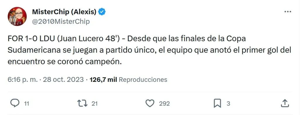 Desde que la Final se juega a partido único, siempre el cuadro que abrió el marcador, se llevó el trofeo, en una estadística que arrancó con Independiente del Valle en 2019, donde Fernando León anotó el primer gol en la victoria ante Colón de Santa Fe por 3-1.