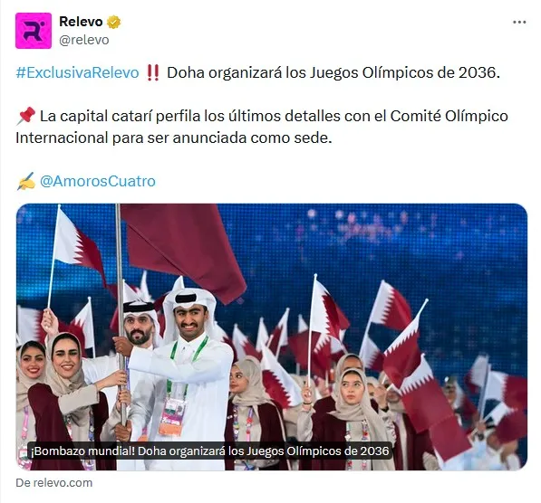El sitio español Relevo es categórico en asegurar que Doha, la capital de Qatar, será la elegida para recibir la Cita de los Anillos, incluso sostienen que dentro del Comité Olímpico Internacional, la decisión está tomada y sólo falta que lo hagan oficial.