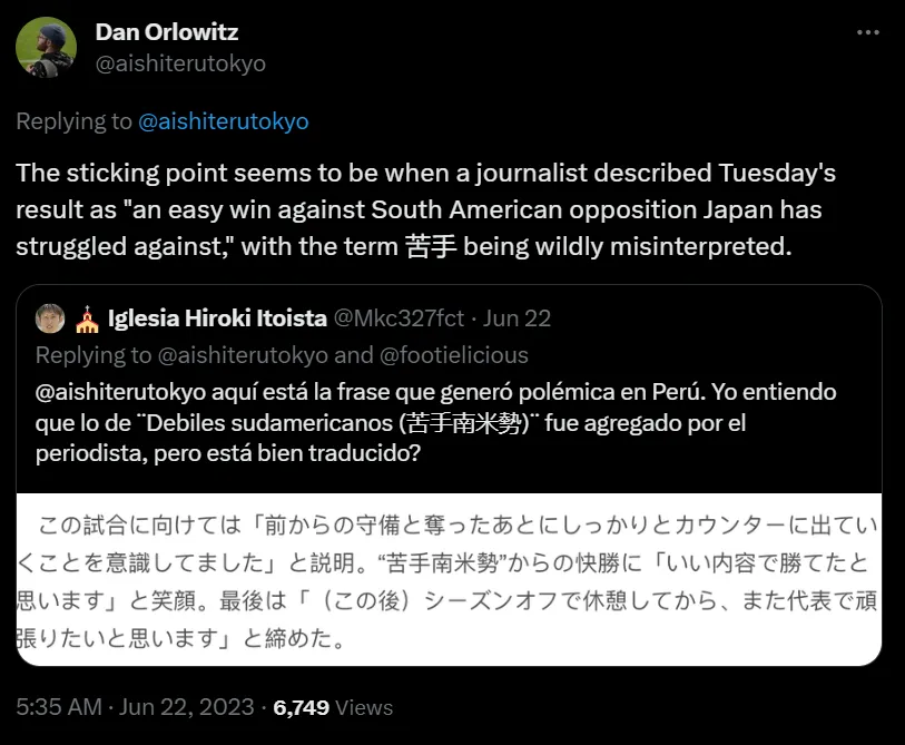 “苦手 no significa ‘pobre’. Significa ‘pobre en’ o ‘no muy bueno en”, para dar a entender que Mitoma en realidad se refería a que Japón suele sufrir contra rivales sudamericanos y no quiso jamás puntualizar que Perú era uno de los débiles contendores de la confederación.