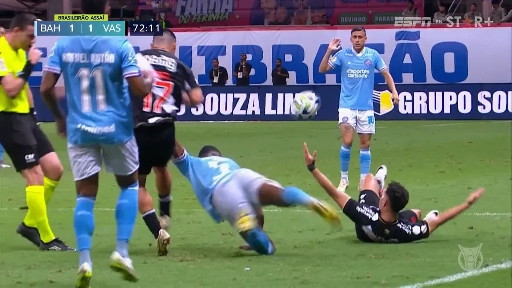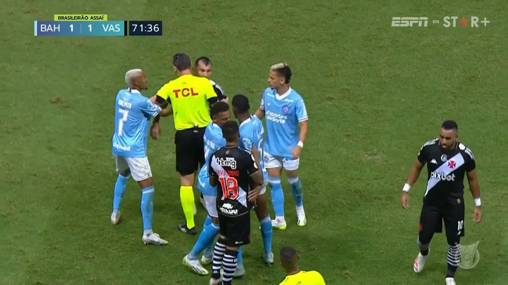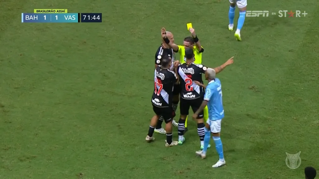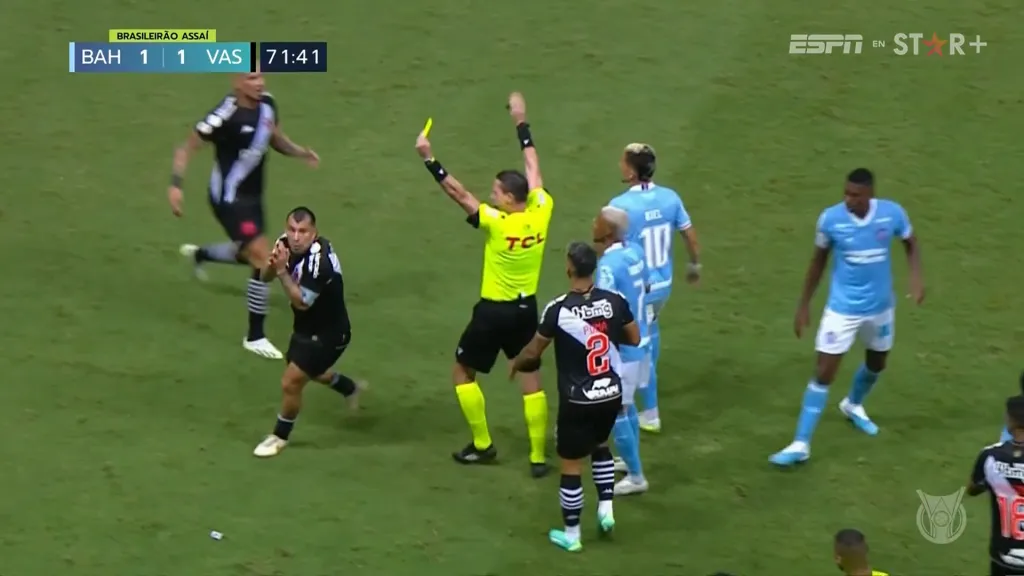 Segundo tiempo del duelo ante el Bahía y Gary Medel va fuerte a la pelota, mientras Rezende está con su espalda contra el suelo. Su pie pasa muy cerca del cuerpo del jugador en el piso y se arma la trifulca. Al árbitro, levanta la tarjeta amarilla.