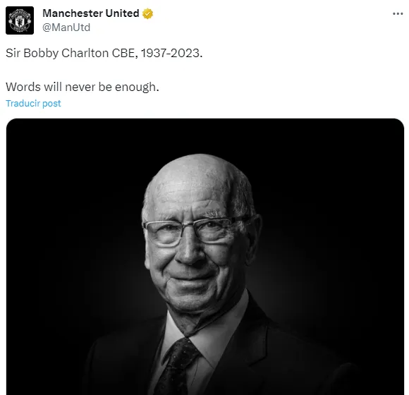 El cuadro inglés sentencia que “tras su jubilación, trabajó en el club con distinción como director durante 39 años. Su incomparable historial de logros, carácter y servicio quedará grabado para siempre en la historia del Manchester United y del fútbol inglés; y su legado seguirá vivo a través del trabajo transformador de vidas de la Fundación Sir Bobby Charlton. El más sentido pésame del club está con su esposa Lady Norma, sus hijas y nietos y todos los que lo amaban”.