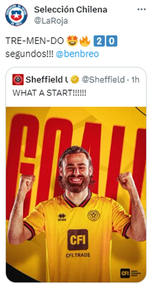 Incluso la misma selección chilena hizo eco del festejo del Sheffield United y se unió a las celebraciones publicando en X “TRE-MEN-DO. 20 segundos Ben Brereton”.