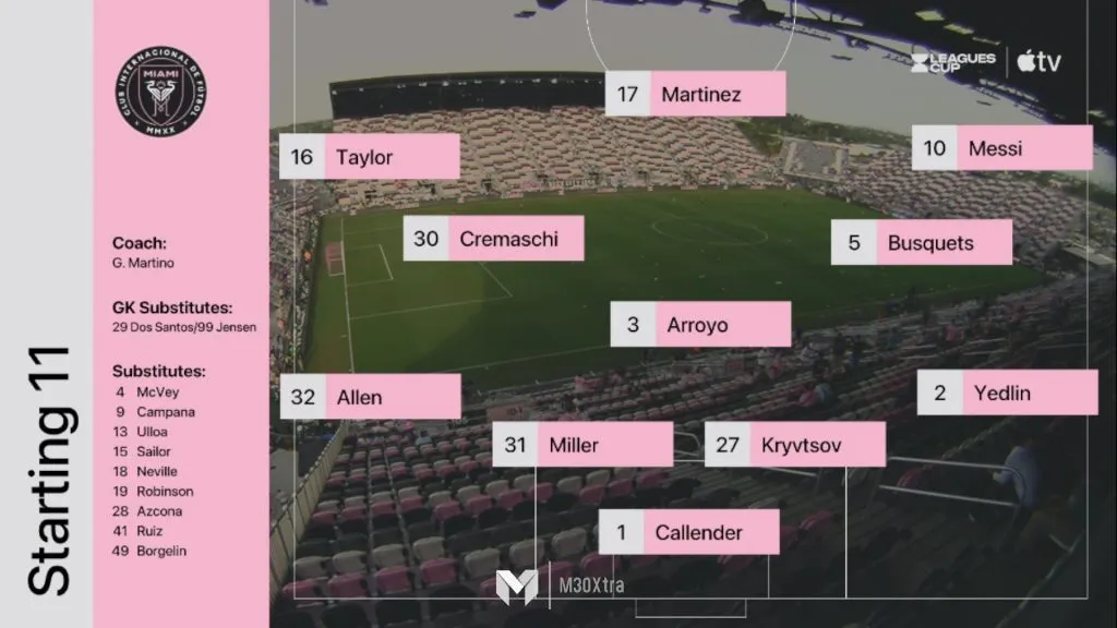 La formación del Inter Miami será con Callender; Yedlin, Kryvtsov, Miller, Allen; Busquets, Arroyo, Cremaschi; Messi, Taylor y Martínez.
