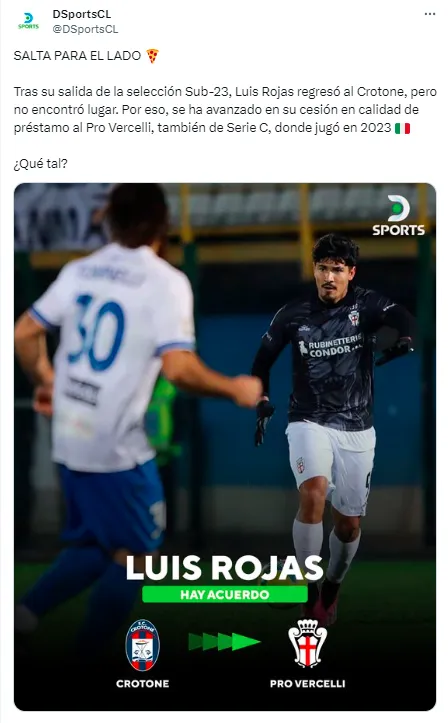 Y el destino quiso que Luis Rojas deje Crotone por los próximos seis meses, pese a que tiene contrato con ellos hasta junio del 2025, para que vuelva a jugar en la institución de Piamonte, donde jugó la temporada 2022-23, en busca de tener más oportunidades.