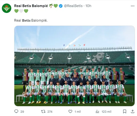¿Y la foto? Una bella postal de colección para los fanáticos del Betis con el plantel y el cuerpo técnico, con el estadio Benito Villamarín de fondo. Bravo aparece al medio en la fila de arriba, a la misma altura de Pellegrini, que está inmediatamente adelante.