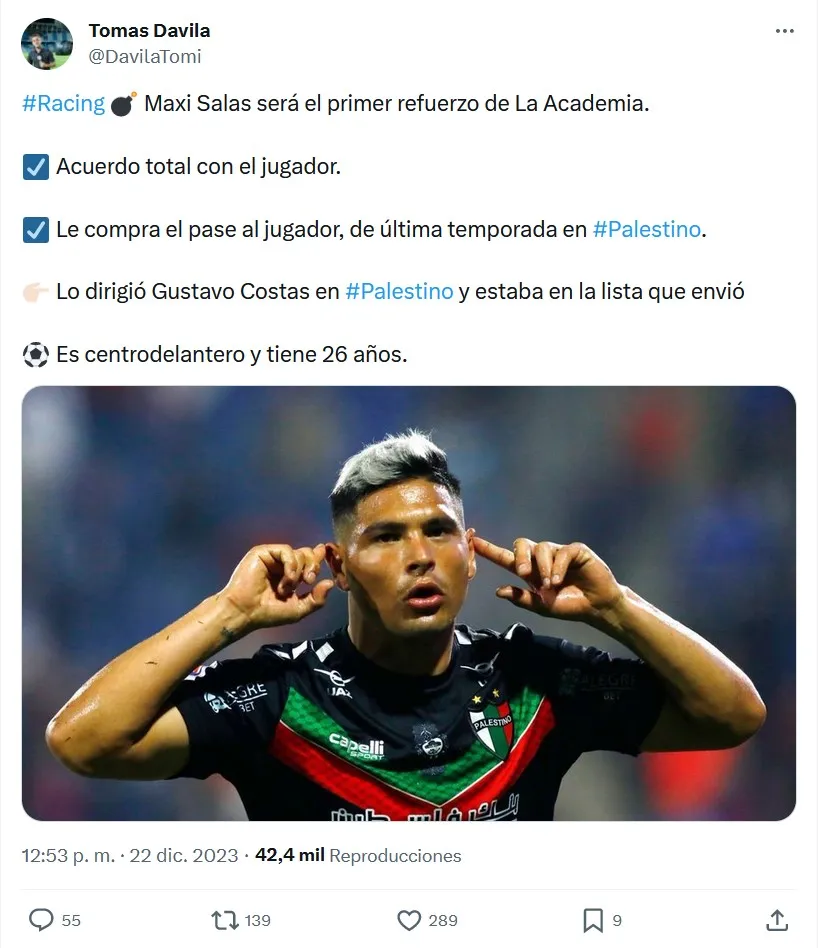 “Maxi Salas será el primer refuerzo de La Academia. Hay acuerdo total con el jugador, y le compra el pase al futbolista, de última temporada en Palestino”, escribió el reportero en Twitter, donde recalca que su arribo es petición expresa del nuevo técnico, Gustavo Costas, a quien dirigió en nuestro país.