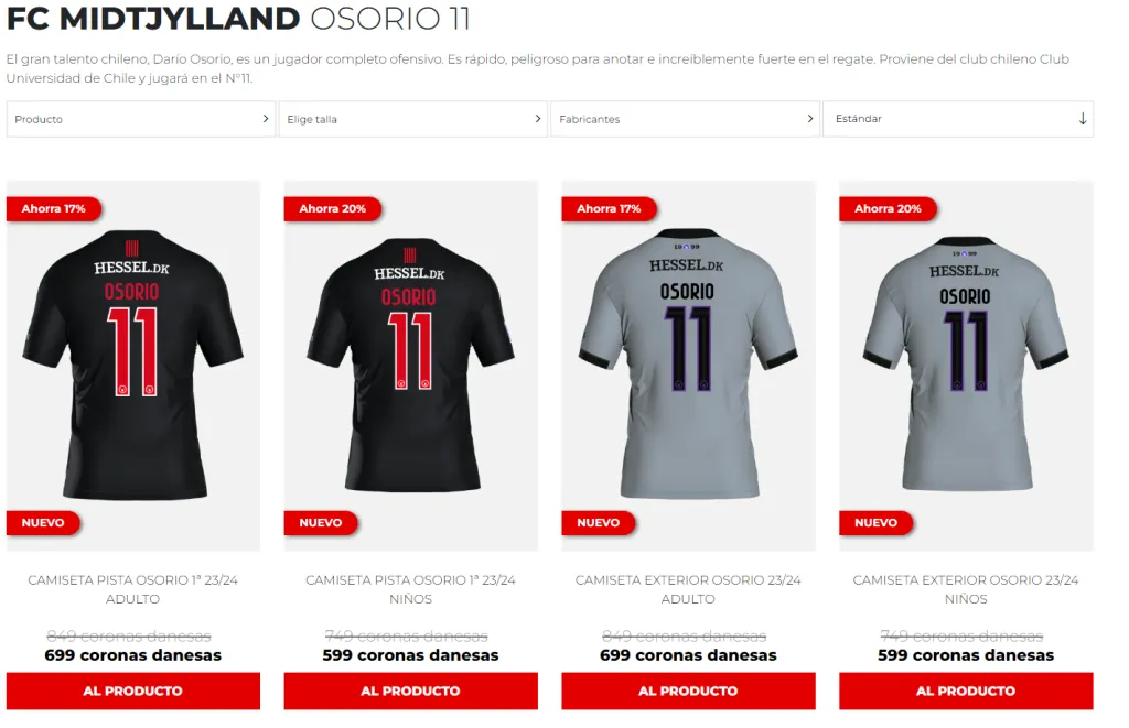Así como una oferta tan llamativa tampoco fue. La nueva camiseta que lucirá Darío Osorio en el FC Midtjylland de Dinamarca ya está a la venta. Tanto la titular como la alternativa están con un descuento. Es de 17 por ciento para la prenda de adulto.