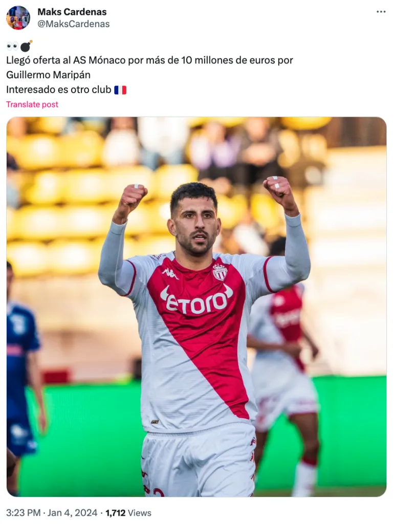 Así lo reveló el periodista Maks Cárdenas en su cuenta de X (ex Twitter) este jueves. “Llegó oferta al AS Mónaco por más de 10 millones de euros por Guillermo Maripán. Interesado es otro club francés”, escribió. El Toqui podría estar viviendo sus últimas horas en el club.