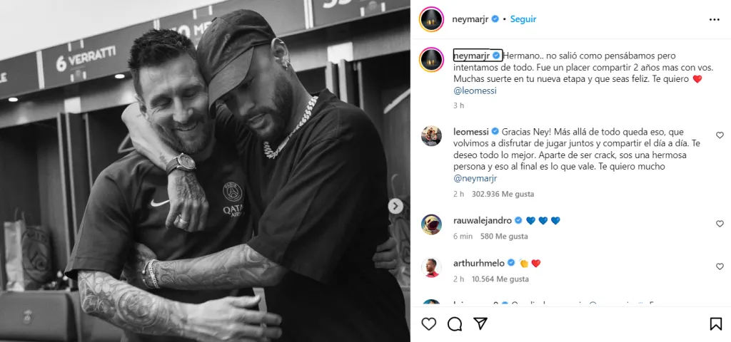 El crack brasileño le dedicó emotivas palabras a su amigo Lionel, con quien también había compartido en el Barcelona de España. “Hermano.. no salió como pensábamos pero intentamos de todo”, dice el comienzo del tan sentido como escueto mensaje que Ney posteó en su Instagram. Obvio, apuntaba a que no lograron ganar la UEFA Champions League. Sí, por supuesto, fueron bicampeones en la Ligue 1.