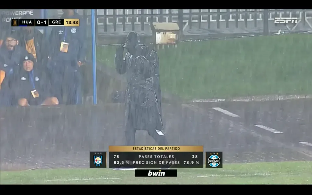 Si bien, por el momento, las cosas no se están dando para los locales, hay cosas del partido que han llamado la atención. Una de ellas, la pinta del DT de Gremio, Renato Gaúcho, quien ha sacado su mejor pinta para la lluvia.