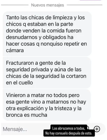 “Tanto las chicas de limpieza y los chicos que estaban en la parte donde venden la comida fueron desnudados y obligados a hacer cosas que no quiso repetir en cámara”, denunció con el pantallazo la mujer.