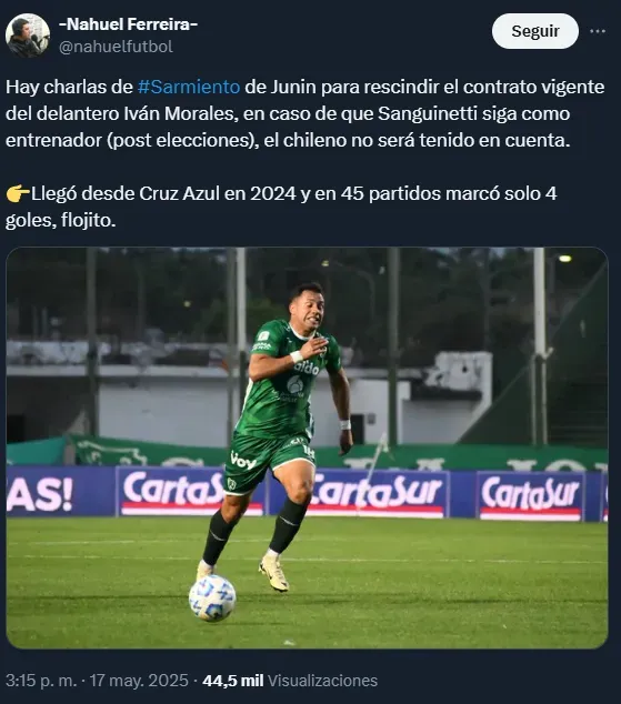 Según el periodista argentino Nahuel Ferreira, el club tomó nota y ya planifica qué pasará con el jugador. “Hay charlas de Sarmiento de Junín para rescindir el contrato vigente del delantero Iván Morales”, comentó el profesional.