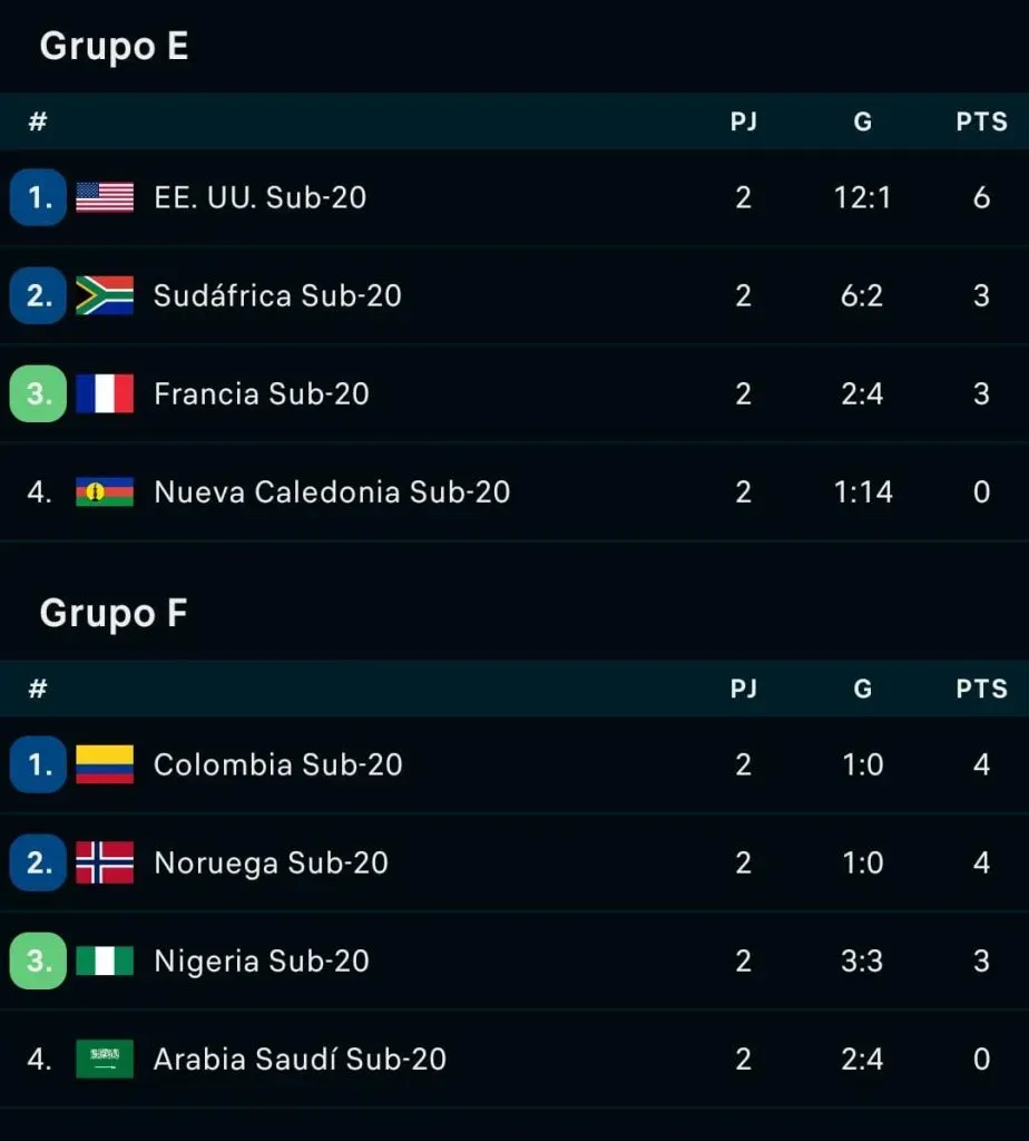 No solo el Grupo E se jugó este jueves, sino que el F también tuvo acción. Ahí, Colombia igualó 0-0 ante Noruega, mientras que Nigeria derrotó por 3-2 a Arabia Saudita. Así quedaron dichas tablas tras la fecha 2: