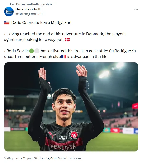 De acuerdo a Bruxo Football, si el extremo de 19 años deja el Betis, el elegido por Pellegrini para ocupar su lugar es nada menos que Darío Osorio, quien según esta publicación va a dejar en el próximo mercado de pases el Midtjylland de Dinamarca.