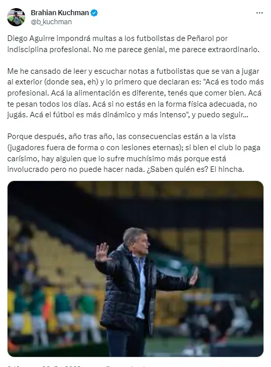Ante esta medida, el técnico del carbonero, Diego Aguirre, se mostró de acuerdo con la propuesta, ya que a su juicio “el jugador está cada vez más profesional. Estoy de acuerdo con que haya un control de la vida profesional y personal. Vamos a estar atentos”.