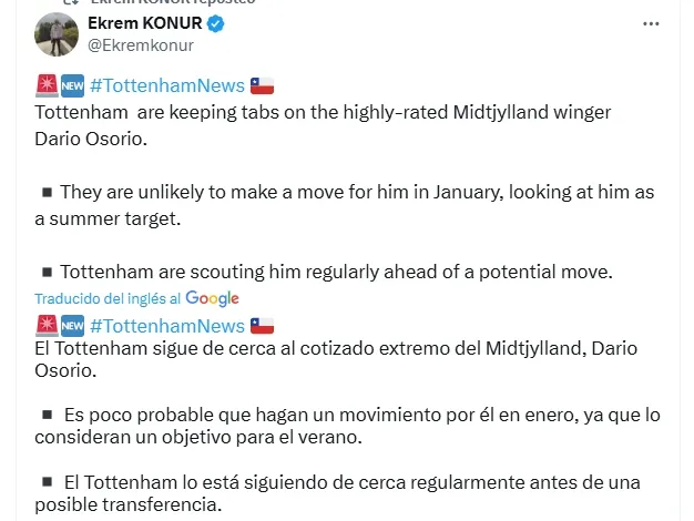 Eso sí, hace una advertencia del plan que tiene el equipo de la Premier League con el jugador: “El Tottenham sigue de cerca al cotizado extremo del Midtjylland, Dario Osorio”.