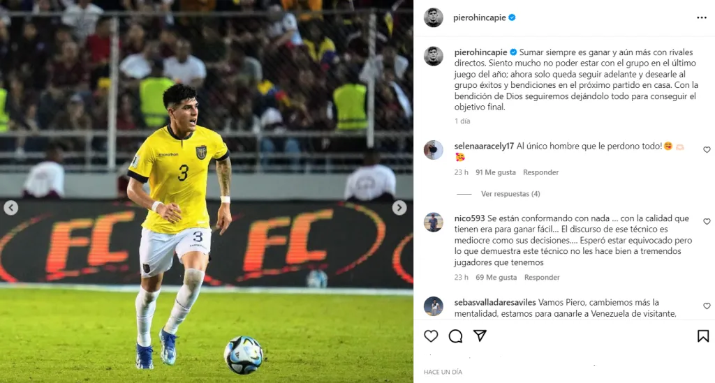 “Con la bendición de Dios seguiremos dejándolo todo para conseguir el objetivo final”, escribió Hincapié en su cuenta de Instagram. Por el momento, el marcador ecuatoriano ha disputado tres encuentros en el camino al Mundial 2026 y ya fue pieza importante del equipo que jugó Qatar 2022.