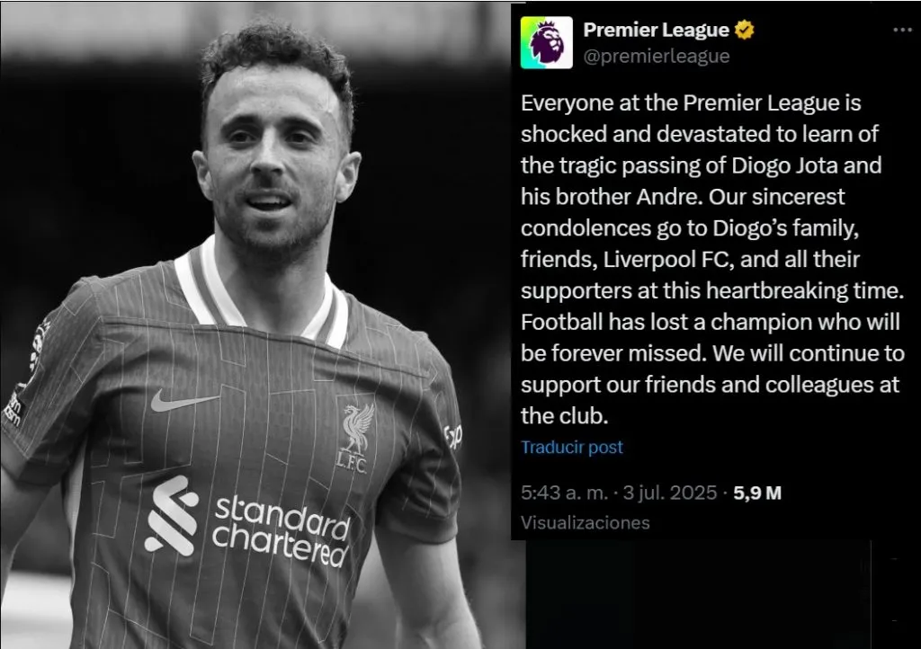 A través de una publicación, la liga inglesa compartió un mensaje en donde señala: “Todos en la Premier League estamos conmocionados y devastados al enterarnos del trágico fallecimiento de Diogo Jota y su hermano André”.