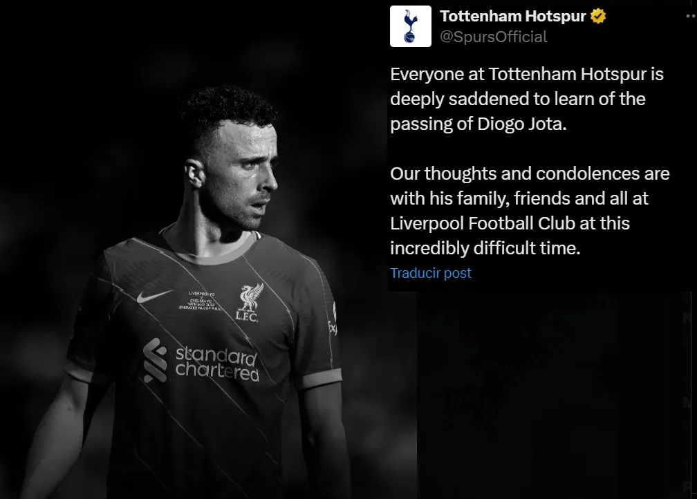 Tottenham también compartió en sus redes un mensaje por la terrible noticia. “Todo el equipo del Tottenham Hotspur lamenta profundamente el fallecimiento de Diogo Jota”.