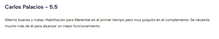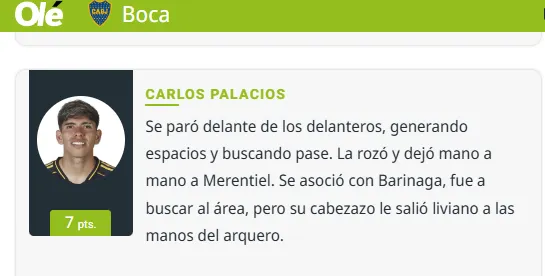 Mientras que TyC Sports le dio una nota 5,5, en donde Carlos Palacios “alternó buenas y malas. Habilitación para Merentiel en el primer tiempo pero muy poquito en el complemento. Se necesita mucho más de él para alcanzar un mejor funcionamiento”. Tarea para la casa.