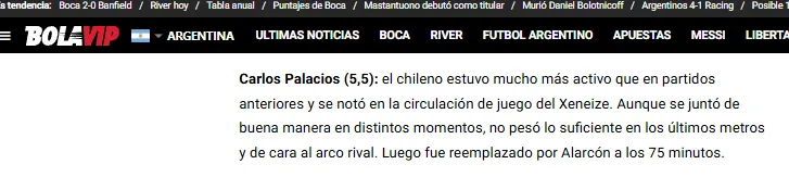 Los 75′ minutos de Carlos Palacios ante Banfield, donde salió reemplazado por Williams Alarcón, no pasaron por alto para la siempre complicada prensa argentina.