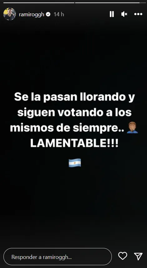 Ramiro González reflejó su desacuerdo con las dos mayorías en las elecciones presidenciales de Argentina. Aunque no aclaró cuál es su candidato favorito para encabezar el gobierno del país. “Se la pasan llorando y siguen votando a los mismos de siempre”, escribió en la citada red social.