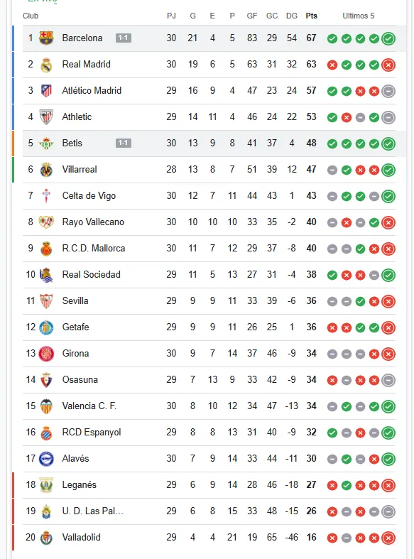 Tras el 1-1 de Real Betis con Barcelona, el cuadro de Manuel Pellegrini quedó en la quinta ubicación de la tabla de posiciones, peleando zonas de copas europeas para el 2025/26, específicamente en Europa League.