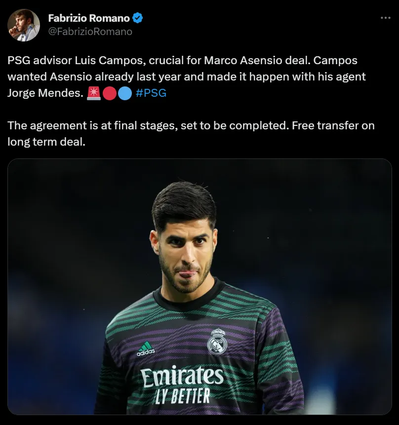 Según informó Fabrizio Romano, una eminencia reporteril del mercado de pases, los contactos entre el actual campeón de la Ligue 1 y Marco Asensio han avanzado por buen camino. “El asesor del club, Luis Campos, ha sido crucial para la operación”, tuiteó el periodista italiano.