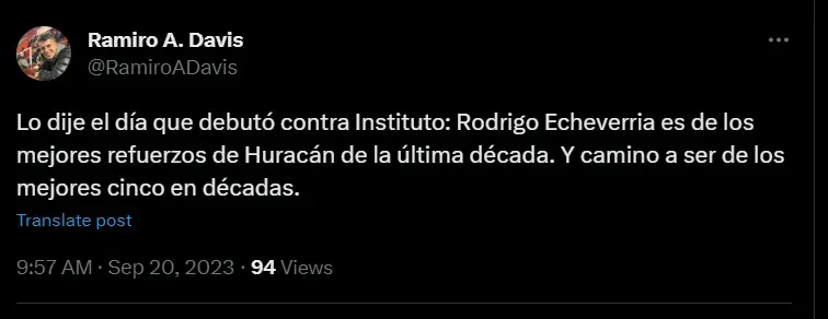 Es más, un periodista y productor de radio Del Plata llenó de alabanzas al polifuncional jugador surgido de Universidad de Chile. “Lo dije el día que debutó contra Instituto: Rodrigo Echeverria es de los mejores refuerzos de Huracán de la última década”, afirmó Ramiro Davis.