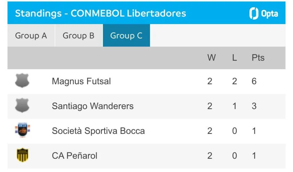 Por ahora en el grupo C el primer lugar es de Magnus, quienes vencieron por 4-1 a los uruguayos, con 6 puntos, mientras Santiago Wanderers es segundo con 3 unidades. El grupo, por ahora, lo cierran Peñarol y Bocca, cada uno con un punto.