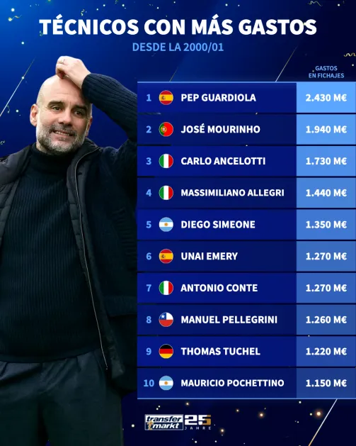 Mediante el listado del prestigioso sitio Transfermarkt, Manuel Pellegrini aparece entre los técnicos que más han gastado en fichajes desde el año 2000 en adelante.