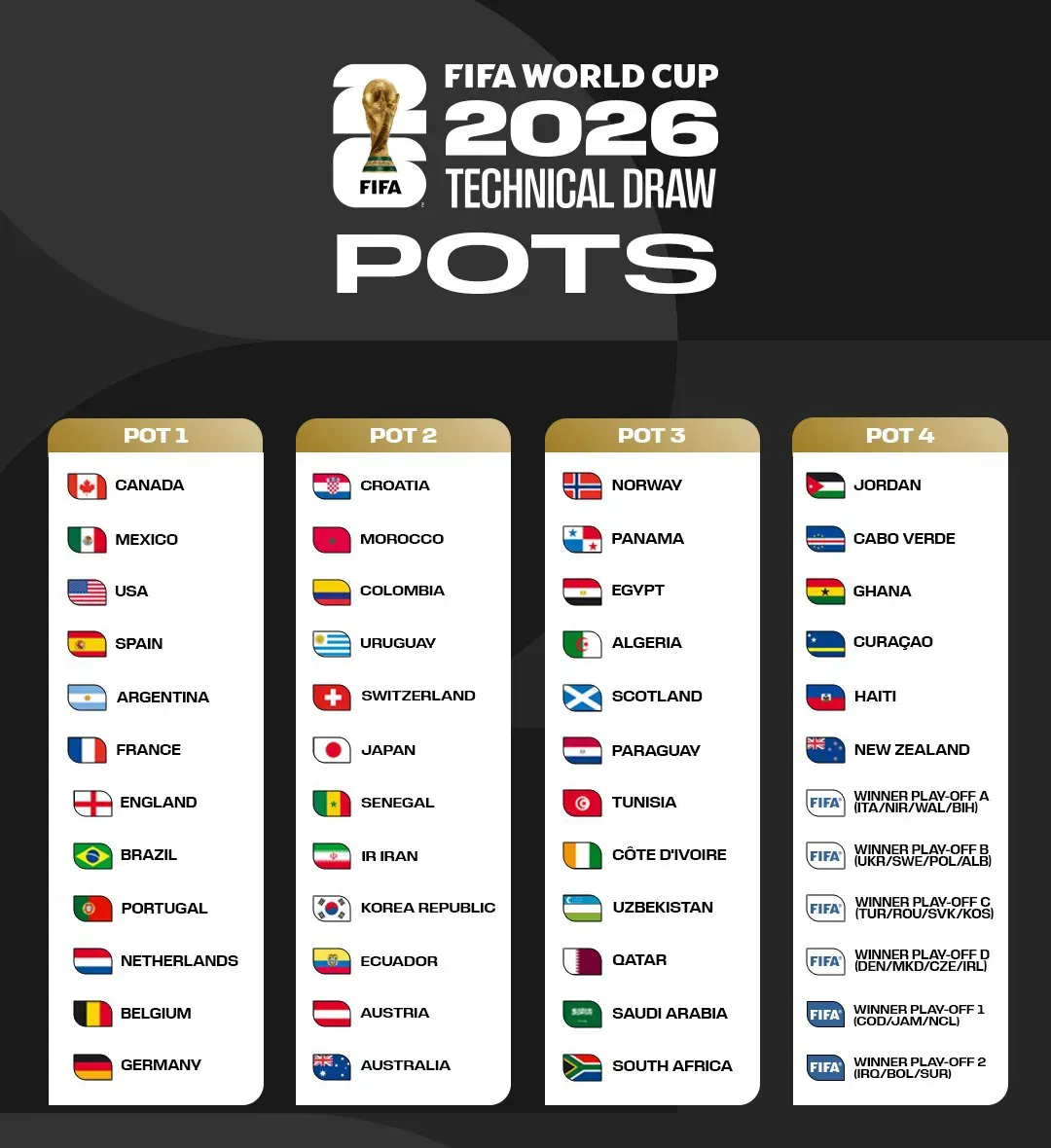 -Bombo 4: Jordania, Cabo Verde, Ghana, Curazao, Haití, Nueva Zelanda, clasificado A y B de la repesca internacional, ganador llave A, B, C y D del repechaje de la UEFA.