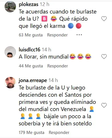 Ahora, fuera del Mundial nuevamente con la Vinotinto, los cibernautas se vengaron a su manera del Pablo Marmol llanero. El día después de la eliminación, su Instagram se llenó de mensajes en su contra, pagando cierto karma por su actitud altanera y egocéntrica.