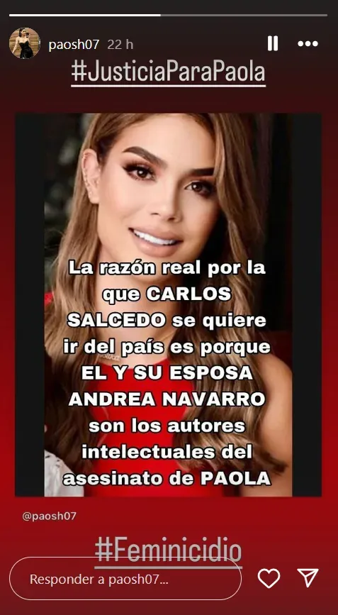 La madre de Carlos Salcedo, María Isabel Hernández, compartió una historia en su Instagram donde sugirió abiertamente que su hijo tuvo que ver en la muerte de Paola. Fue con un mensaje que emergió de la cuenta de Instagram de su fallecida hija.
