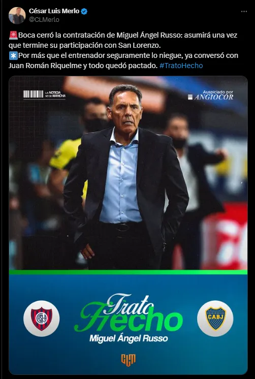 La información la entregó a través de su cuenta de “X” el periodista, y especialista en mercado, César Luis Merlo (@CLMerlo), quien junto a una imagen del DT y la frase “Trato Hecho” señaló: “Boca cerró la contratación de Miguel Ángel Russo: asumirá una vez que termine su participación con San Lorenzo”.