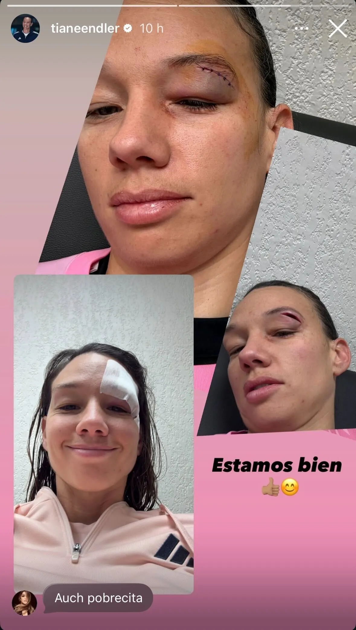 Fue a través de sus redes sociales, donde la guardameta compartió fotografías de su rostro luego del procedimiento médico, donde se aprecian claramente los puntos de sutura (imagen sensible). En total, recibió cinco puntos y acompañó la publicación con un tranquilizador mensaje: “Estamos bien