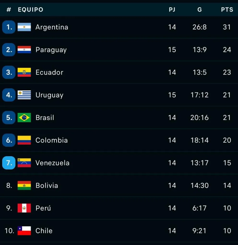 Tanto Brasil, Ecuador, Paraguay y Uruguay siguen en posiciones de clasificación al Mundial 2026. Con ello, dichos equipos tienen aún una gran distancia respecto a Chile, quien se aferra al cupo de repechaje. Así quedó la tabla: