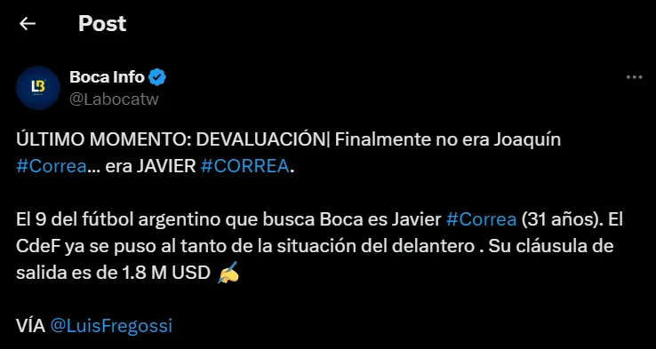 Con el correr de las horas todo se corrigió. Es más, algunas cuentas de información boquense salieron al paso de esta especie de alcance de nombres. El Twitter Boca Info definió la situación con un concepto elocuente: “Último momento: devaluación. No era Joaquín Correa”, reza la primera parte de la publicación.