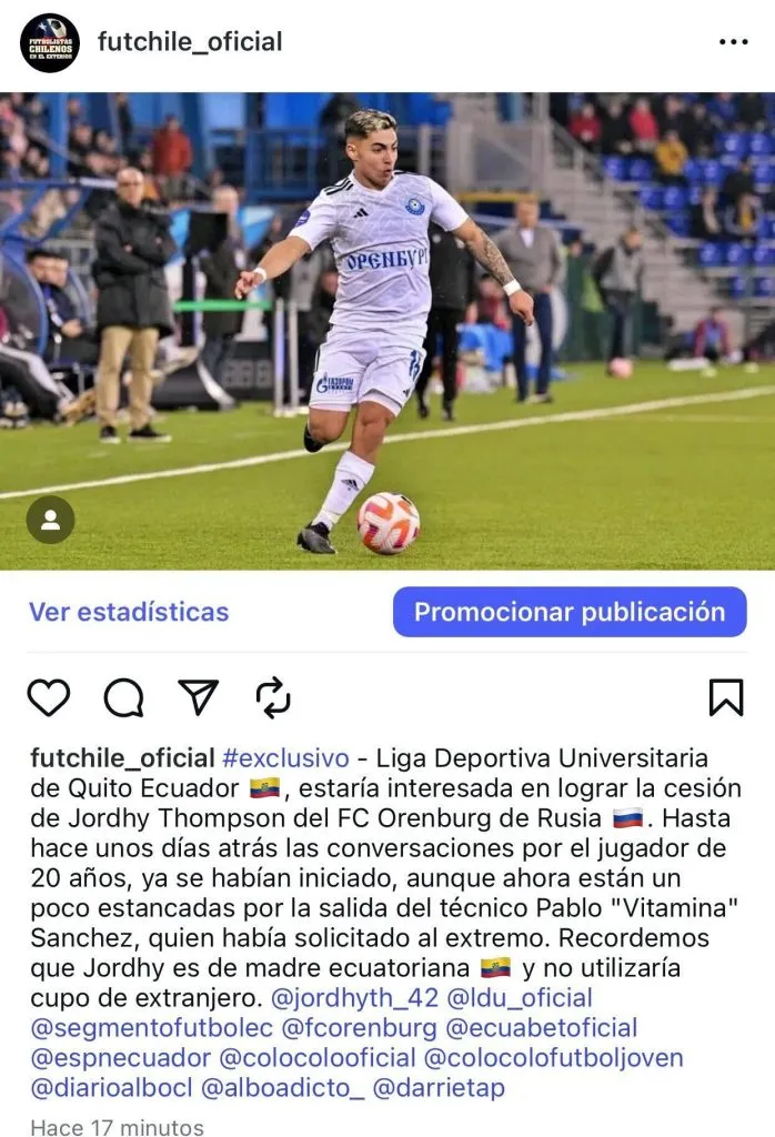 Así lo detalla el sitio FutCHILE, quienes, en sus plataformas digitales, dan cuenta del interés de la Liga de Quito en poder contar con Jordhy Thompson, teniendo en cuenta de que no utiliza uno de los cupos internacionales.