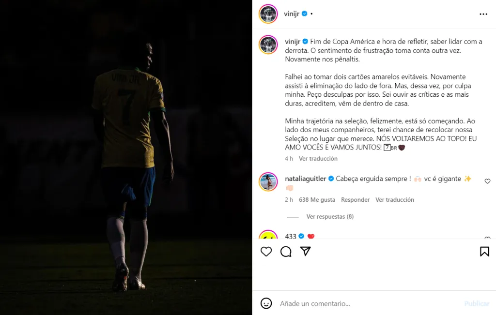 “Se acabó la Copa América y es hora de reflexionar, saber lidiar con la derrota. La sensación de frustración vuelve a surgir. Otra vez en los penaltis”, dijo Vinícius Júnior a través de Instagram.
